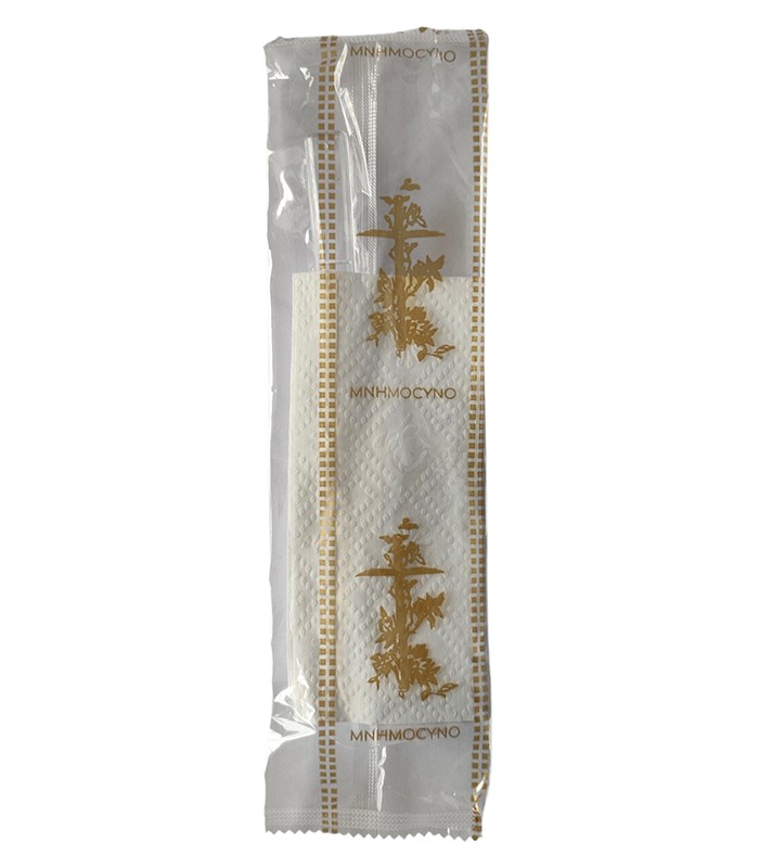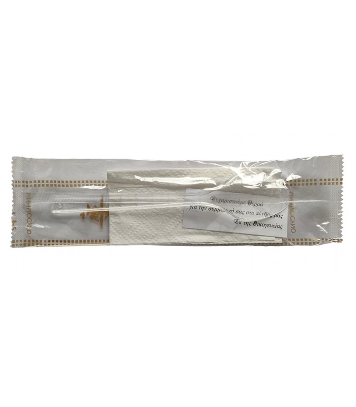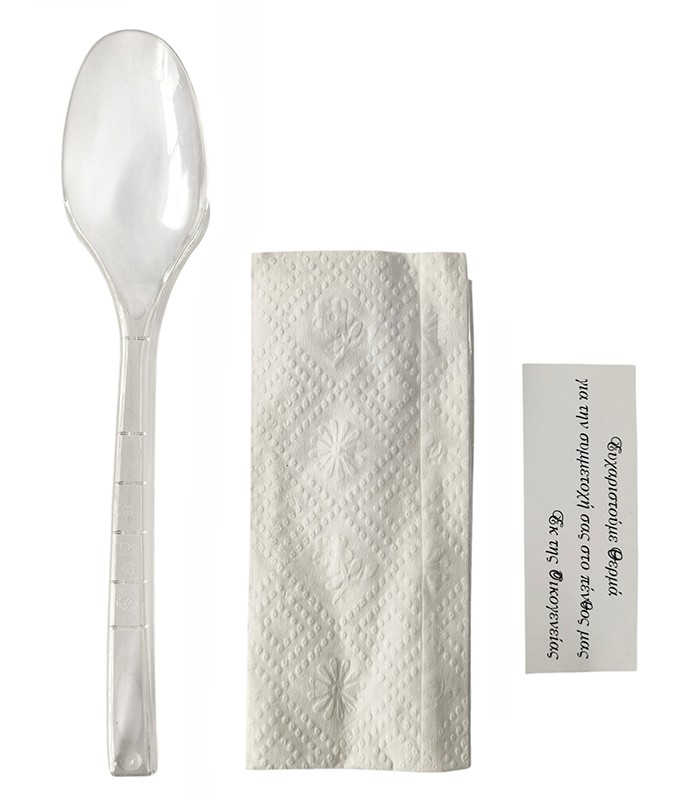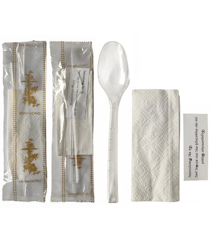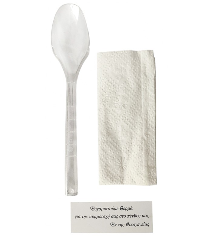 Κουβέρ μνημόσυνου με πλαστικό διάφανο κουτάλι και χαρτοπετσέτα. Το κουβέρ μνημόσυνου χρησιμοποιείται στο τραπέζι του φαγητού αντικαθιστώντας το απλό κουτάλι ή μπορείτε να το δώσετε μαζί με το σιτάρι.